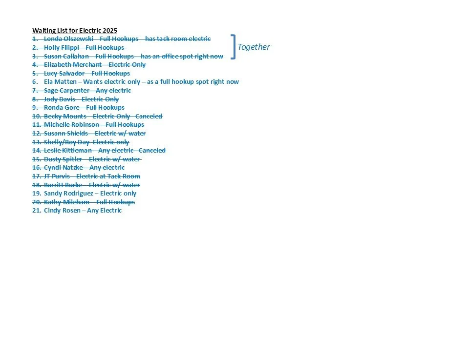 Pre-registered stalls, and electrical spots can be reclaimed by July 1st. After that, you go to the back of the line with everyone else. Your names are in green below on the stall and electric assignments. Please put yourself on a waitlist if you want one of them, and are not pre-registered. Don’t hope one opens up as we get closer and now you are #20 on the waitlist when you could have been #2.
